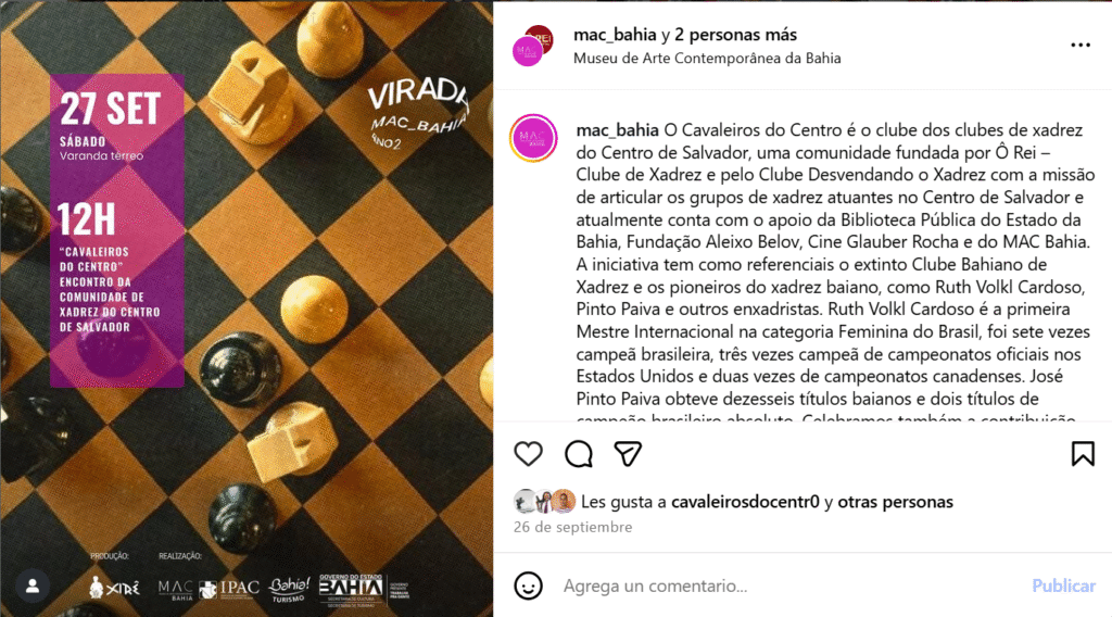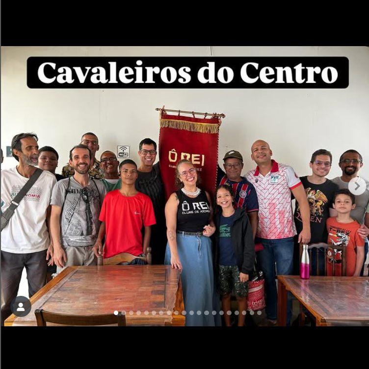 O grupo Cavaleiros do Centro é uma iniciativa fundada por Ô Rei – Clube de Xadrez e pelo Clube Desvendando o Xadrez com a missão de articular os grupos de xadrez atuantes no Centro de Salvador. Ambos os clubes foram fundados em 2022. Ô Rei – Clube de Xadrez foi criado com o intuito de reunir enxadristas alinhados com princípios de transformação social, inclusão e colaboração. A missão do clube é ampliar o acesso ao xadrez como prática lúdica e educativa, fortalecendo vínculos com outras iniciativas e coletivos autônomos. De outro lado, o clube Desvendando o Xadrez nasceu da atuação generosa do professor Alan Gama, que iniciou oficinas voluntárias na Biblioteca. Sua atuação inspirou os jovens José Gabriel da Silva, Geraldo Cerqueira Santos Neto e João Paulo Conceição Santana a assumir liderança da iniciativa, hoje eles consolidaram uma presença ativa, plural e comunitária no espaço.