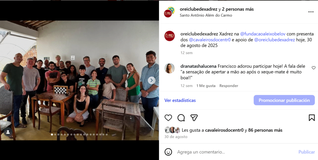 Grupo dedicado ao xadrez de forma geral e encontros virtuais para compartilhar conteúdos relacionados ao xadrez (partidas, análises, dicas, torneios, estudos), trocar ideias construtivas e perguntas sobre estratégias, aberturas e finais. - 🛜CAVALEIROS DO CENTRO-online (link):