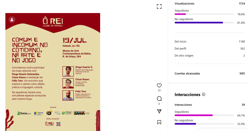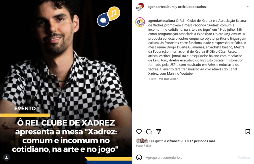 Ô Rei – Clube de Xadrez e a Associação Baiana de Xadrez promoveram a mesa redonda “Xadrez: comum e incomum no cotidiano, na arte e no jogo” em 19 de julho, 15h no Museu de Arte Contemporânea da Bahia – Sala Multiuso (Rua da Graça, 284) como programação associada à exposição Objeto (In)Comum. A proposta conectou o xadrez enquanto objeto, prática e linguagem cultural às fronteiras entre funcionalidade e expressão artística.